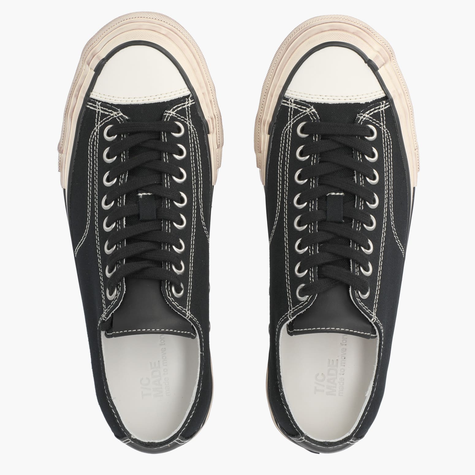 ハンドメイドならではの丁寧な“汚し加工”を施し、履き始めからこなれた雰囲気を演出します。ブラックキャンバスのシンプルなフォルムに、独自の加工が加わることで、他にはない深みのある表情に仕上がりました。